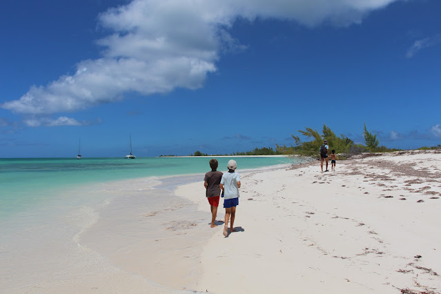 Nous quittons Sandy Spit pour rejoindre Great Harbour mais sur l'écran de navigation les enfants repèrent Aria qui mouille à Sandy Cay. Nous les rejoignons à la plage pour une session de skim et de bodyboard dans les vagues.
